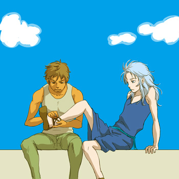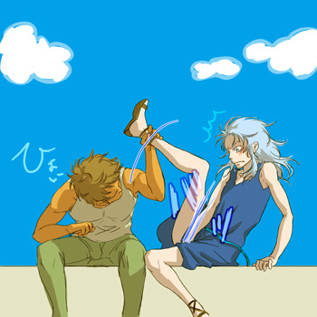 って、どの道文句をつけるとイイ!ロスがこんなことしなければパンツの有無なんて全然問題無いのに、そこは棚上げで。そして驚きと怒りが一気にMAXになったサガは頭のぼせちゃって口パクパクで涙目になってロスを睨んでみたり。でもサガのそんな顔を見たら少年ロスは何かもう【色々モヤモヤムラムラ&そう思ったことが照れくさい】って胸裏でしちゃって、それが顔に出そうになったので慌てて深々とアタマを下げてサガに謝ってみたり。ゴメンナサイ1割・表情隠し9割とかいう反省の色が全くない謝罪をするロス...。そしてサガはロスが幾ら謝ろうとも一通りは叱り倒すも、なんだかイマイチ暖簾に腕押しな感じのロスにアキラメ気味に渋々腹の虫を収めてあげて「今度はふざけないでチャンと取れ!」って靴紐ほどきの続行を命じればイイ...。天然で時に女王さまな感じになるサガにロスは「はいはい~」とか言いながら上機嫌で従ってみたりしてくれれば嬉しいなぁ......。